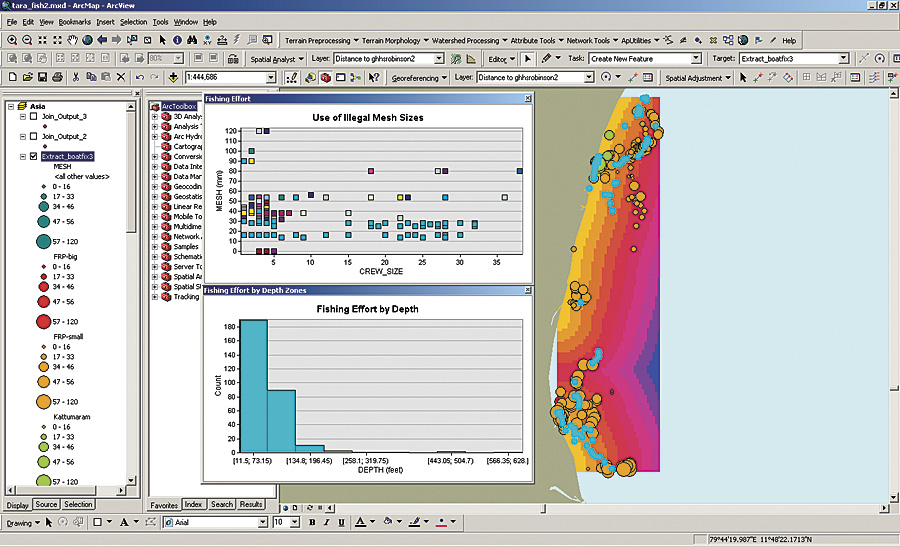 The "what" is quite detailed, as there are roughly 243 species of fish recorded that are caught, sold, and consumed. The "where" and "how deep" questions were covered by a straightforward GIS application using existing coastline maps, GPS, and a Humminbird echo sounding device. The "when," "who," and "with what" data was supplied by observation as researchers traveled standard fishing routes in three regions of the Coromandel Coast in the Bay of Bengal. Catch data would no longer be 300 kilos of shad, but rather, for example, 300 kilos of shad caught at 79.38765 E, 12.345 N at a 20-meter depth in sandy soils by five men using 25 millimeter nets who fished from 7:00 a.m. to 8:30 a.m. on January 3, 2008.