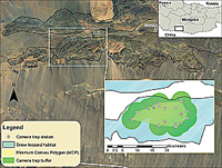 The SLC survey was undertaken in May–July 2007 in the isolated desert massif of Tost Uul in the South Gobi province (100�35'E/43�10'N). The conservancy deployed 20 TrailMaster TM1550 active-infrared sensors for detecting the passage of any warm-blooded animal. These were connected to two cameras positioned to photograph either side of a passing snow leopard, with all traps set along characteristic travel paths next to clusters of scrapes or active scent rocks. SLC captured 120 snow leopard photographs during the 66-day survey, and it identified the individuals by their distinctive spotting pattern. From the number of captures and recaptures of each cat, it was able to estimate the total number present within the survey area.