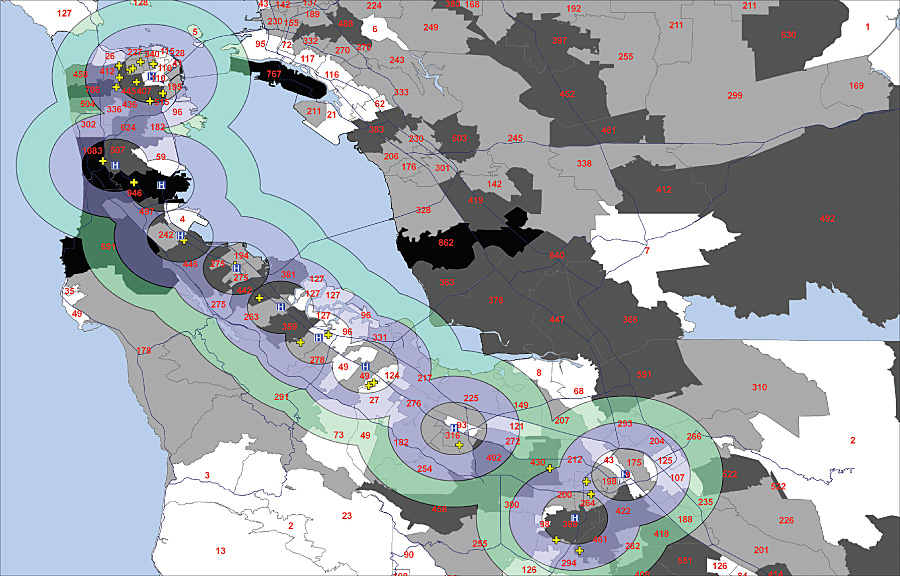 GIS also allows the hospitals to precisely target candidates and use direct mail to reach them. In addition, mapping and analysis of workforce retention data provide insight into why nurses leave the medical center to work elsewhere. For example, when Schutt compared the medical center location to latitude-longitude points of all other hospitals on the San Francisco Peninsula, applying a buffer at two, four, and six miles and comparing it to other internal retention data, it became visually obvious that nurses just starting their careers could actually leapfrog from one hospital to another, up and down the peninsula, until they were able to locate the right pay and the right shift, as most of these other locations are potentially within their comfort zone.