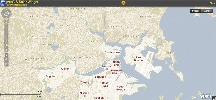 The Solar Widget application for ArcGIS shows house-by-house potential for solar power generation in the city of Boston, Massachusetts.