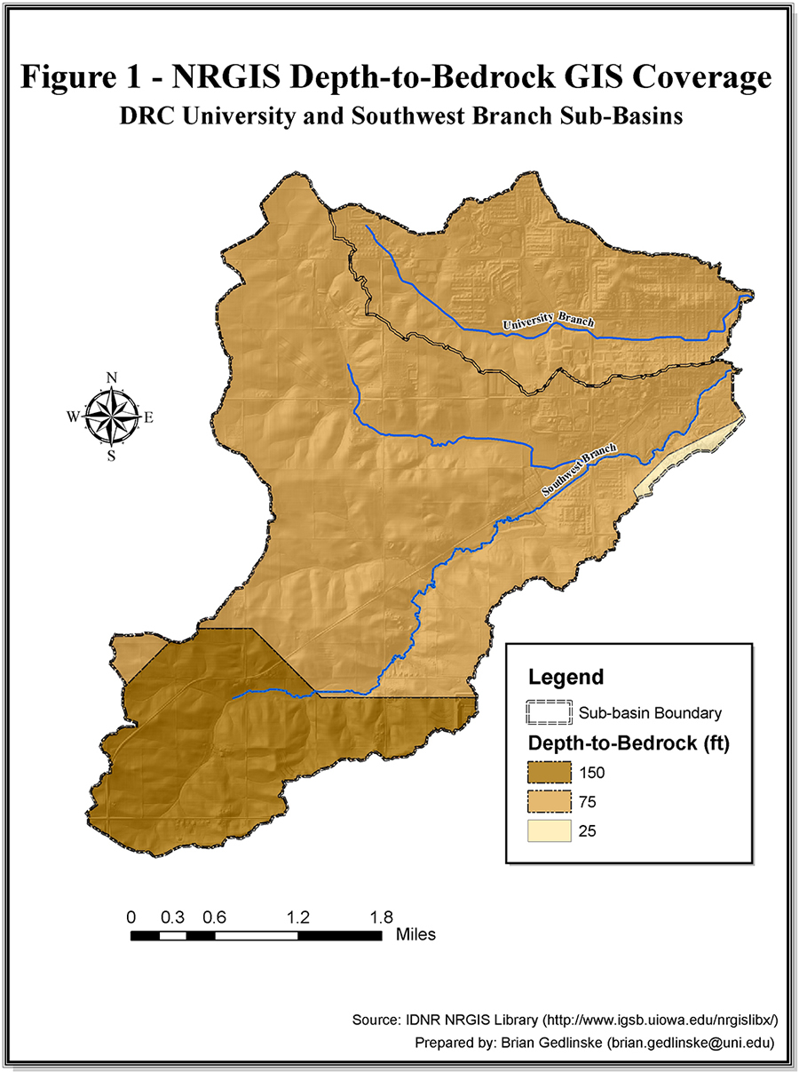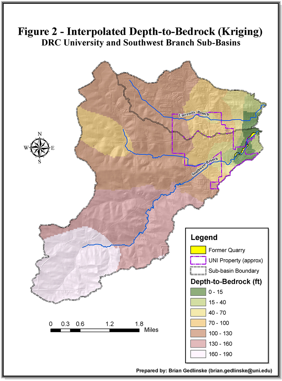 The effort to construct a more accurate depth-to-bedrock representation of the area relied extensively on ArcGIS to compile information, interpolate data, and illustrate the findings. This representation conveys a dramatically different message with regard to aquifer susceptibility. Data interpolation identifies a broad ridge of shallow bedrock along the DRC's Southwest Branch, a representation consistent with the bedrock exposures observed along the stream channel southeast of UNI's campus. Shallow bedrock, historical descriptions of the DRC as an ephemeral stream (caused by karst swallow holes), and groundwater-surface water elevation comparisons indicate a strong hydraulic connection between the DRC and the aquifer. Although a century of hydrologic alterations to the watershed (e.g., urban runoff, agricultural practices, cooling water discharge, and anthropogenic stream channel modifications) have transformed the DRC from a disappearing stream to a perennial tributary of the Cedar River, the aquifer undoubtedly remains more susceptible to surface contamination than typically alluded to in existing literature and generalized GIS datasets.