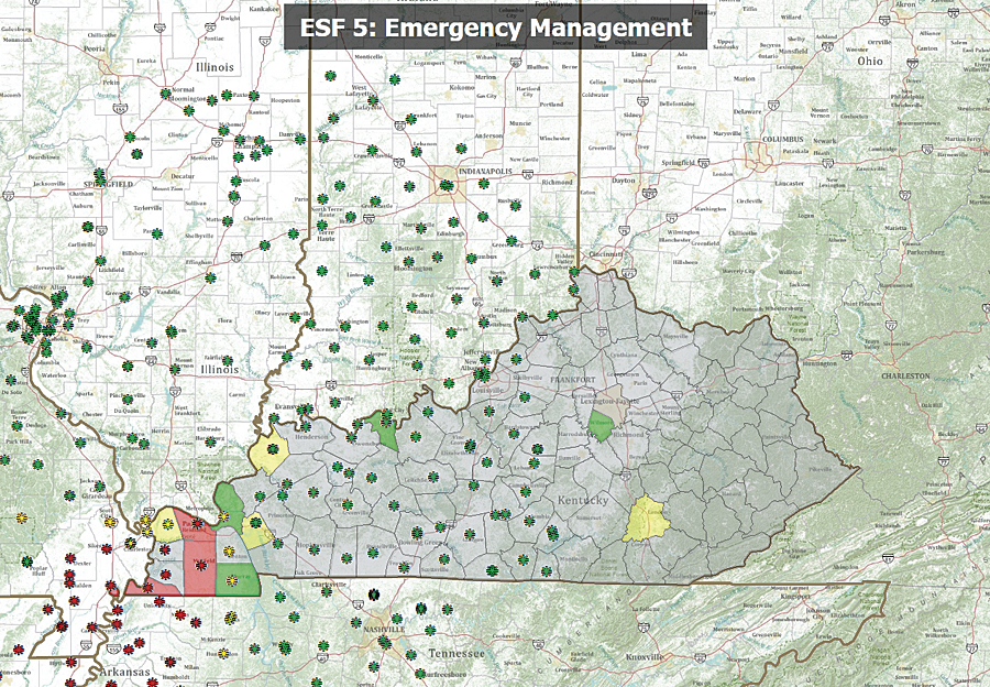 Esri technical and public safety solutions staff worked with multiple stakeholders for over a year to bridge the gap between isolated data silos and true regional situational awareness. Agencies such as the Kentucky Division of Emergency Management (KYEM), Indiana Department of Homeland Security, and the National Guard were provided with GIS technical assistance by Esri staff. Esri worked closely with a number of organizations to define GIS requirements in support of the exercise. Esri also worked closely with staff from US Department of Homeland Security pilot Virtual USA and Esri Partner ESi of Augusta, Georgia, in helping agencies access GIS data services and conduct briefings. To support a number of briefings, Esri worked closely with the KYEM staff to provide a GIS-based briefing tool using ArcGIS Explorer Online with a number of views that provided status on all the emergency support functions (ESF).
