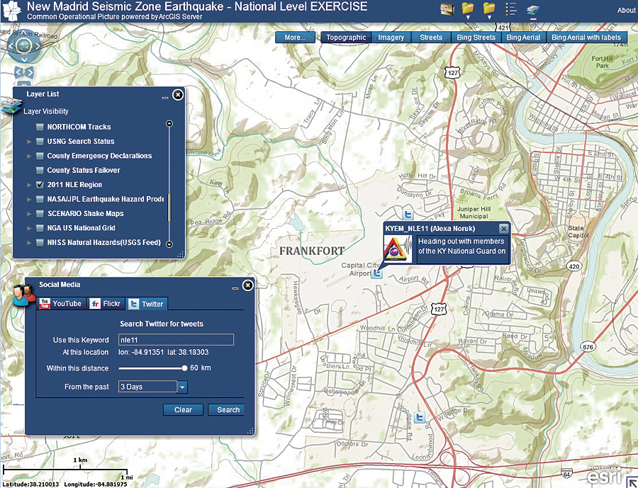 Using a social media widget in the common operating picture, the public information officer (for the Commonwealth of Kentucky Division of Emergency Management) was tracked during the National Level Exercise.