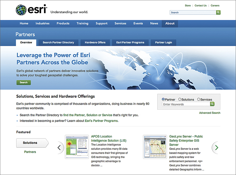 The all-new Esri Partner Directory makes it easy to find innovative solutions and services from Esri Partners across the globe. With easy access to information on more than 1,600 Partner listings, the new Partner Directory allows filtering by industry, types of solutions and services, location, keywords, and more.
