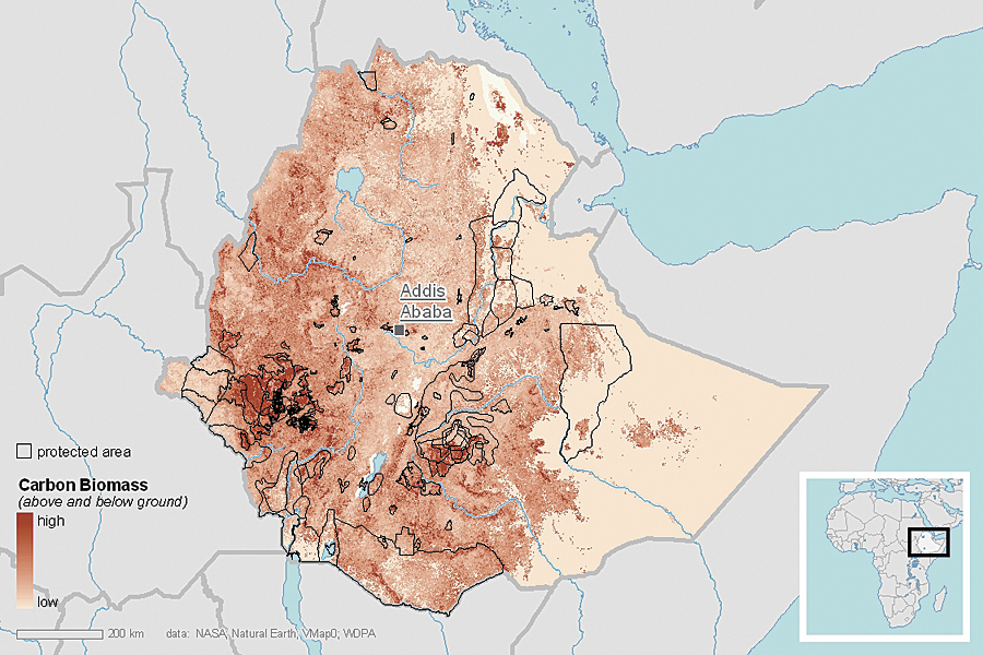 This map was part of a series created for the first Summit for Sustainability in Africa, held in Gaborone in May 2012 to demonstrate the natural capital of participating countries. In this example, the ecosystem service of climate regulation through carbon storage is shown, along with the country's protected area network.