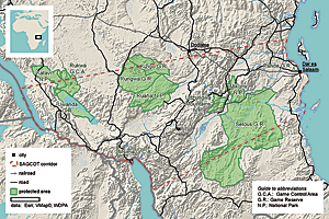 Map showing the Southern Agricultural Growth Corridor of Tanzania (SAGCOT), where the government is attempting to transform agricultural development, increase food production, and reduce poverty through a targeted program of public-private partnerships. The corridor is critically important for maintaining natural capital and contains important protected areas that also provide revenue from ecotourism.