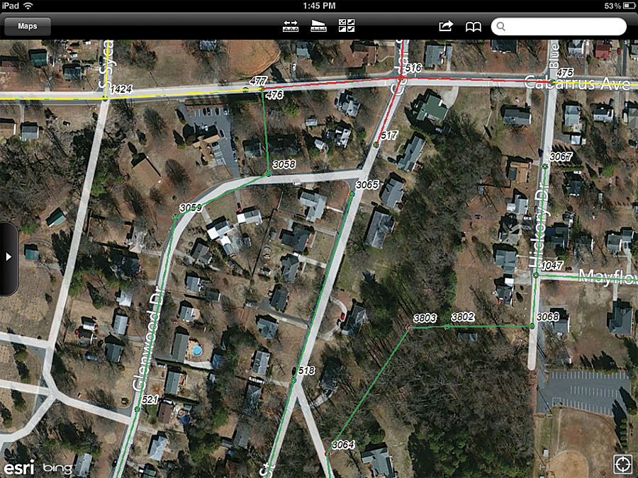 The Esri application on the iOS device displays the sewer cleaning data and the Manhole IDs (MHIDs); therefore, the user knows if that line has been cleaned recently.