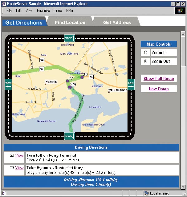 With the release of ArcIMS 4, Esri offers major new enhancements to the software, in addition to new ArcIMS extensions and a new version of the ArcIMS Site Starters. One of the most significant features included in the box with ArcIMS 4 is the new ArcIMS Metadata Server, which can be used to create a central, online metadata repository that facilitates publishing and browsing metadata over the Internet. This metadata is created using the ArcGIS 8.2 ArcCatalog application. The metadata, which is stored in a relational database, is accessed using ArcSDE. Another major enhancement included with ArcIMS 4 is the new Java Connector. This fully supported connector replaces the Application Server Link in ArcIMS 3.1. The connector allows users to program Java clients and Java applications that use a set of serverside Java Beans. A new object model, Java Server Pages (JSP), tags libraries based on the new object model, and a full range of samples are included. Users now have an even wider choice of operating systems on which to run ArcIMS. With the release of ArcIMS 4, the software is supported with Linux and HP-UX operating systems, in addition to existing ArcIMS support on IBM AIX, Microsoft Windows, and Sun Solaris platforms. ArcIMS 4 supports two new optional extensions--the ArcIMS Route Server and the ArcMap Server. ArcIMS Route Server ExtensionArcIMS users now have the option of adding routing capabilities to their ArcIMS-powered Web sites with Esri's new ArcIMS Route Server extension. ArcIMS Route Server offers the ability to incorporate fast, accurate routing and point-to-point driving directions into Web sites built with ArcIMS. It also calculates optimal routes based on time and distance and accommodates multiple stops along a route. "Because Route Server is an extension to ArcIMS, it lets users take advantage of ArcIMS software's unique capabilities," says Bernie Szukalski, ArcIMS product manager. "ArcIMS Route Server users can customize map output, use image rendering and feature streaming, and perform spatial and attribute queries."