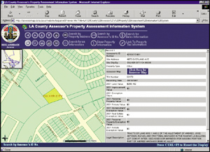 For forward-thinking government entities like the County of Los Angeles' Assessor's Office, a revolution is taking place. Agencies are leveraging the Internet to serve constituents with valuable information about their communities and at the same time saving money, time, and resources. It's simply government operating at maximum efficiency. A key part of this revolution involves Internet GIS. The Los Angeles County Assessor's Office is one branch of the County's Property Taxation System. Other branches include the Offices of the Registrar-Recorder, Auditor-Controller, and Treasurer-Tax Collector. The Assessor's responsibilities include serving the public, locating and identifying ownership, establishing values, completing an assessment roll, and applying all legal exemptions. Under the County Assessor's Office is the Assessor's Mapping Services Section. For decades, the ownership and property tax data sets were recorded on thousands of paper maps. These maps span Los Angeles County, which is the most populous county in the nation and is larger in population than 42 states in the United States. Los Angeles County's approximately 9.9 million residents live within its 4,083 square miles, making it one of the largest counties in terms of area as well. In the past, property and tax maps were only available to citizens who visited the Assessor's offices and made requests for hard-copy information. The Assessor's Mapping Services Section began automating its map-making and editing efforts with GIS in the late 1980s. Through the years, the organization grew and matured as a GIS site, and in 1997, Mapping Services acquired ArcIMS with the goal of providing data more easily to the public via the Internet. "We wanted to provide a service to constituents that made parcel and property value information available so that they, in turn, could make informed decisions," says Richard N. Quacquarini, chief cadastral engineer, Office of Los Angeles County Assessor's Mapping Services Section. "We wanted something that was intuitive and very user friendly and provided the targeted functionality whether a user has a slower dial-up connection or a faster broadband connection."