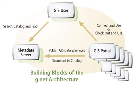 In practice, each node in an SDI would be built to provide one or more of these three capabilities. For example, a city might provide a catalog referencing the available data and services at its Web site along with a series of data and mapping services. A small GIS shop would be able to access and use those services in their ArcView seat across the Internet. In another case, a state government might provide the metadata catalog describing its services as well as data and services at other GIS portals within the state. The state might also publish GIS Web services with a set of HTML clients to access various Internet map and data services. At its most basic level, a Spatial Data Infrastructure is realized through a catalog holding metadata about available data and services. As the number of participating organizations and users grow, so will the numbers of entries and complexity of the metadata catalog. The role of a metadata server and search tools becomes more critical. What Is g.net?g.net is an architectural vision for how Esri users build parts of and participate in a Spatial Data Infrastructure. g.net describes how ArcGIS, ArcIMS, and other Esri software technology are used.