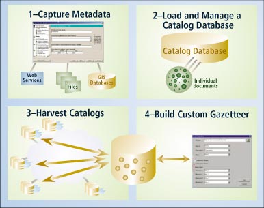 GIS catalog portal users are able to do the following: Search a GIS catalog portal for image and feature Web services, images, geographic data sets, contacts, activities, and clearinghouses. GIS users will be able to perform searches in real time on GIS metadata or on multiple metadata clearinghouse nodes through the GIS catalog portal. Users can set geographic search boundaries or use a graphic selection tool to define a search area. Search criteria can be based on content type such as Web map services, geographic data sets, a data theme, or a date range. Search results will be displayed with metadata about the product and a map, if appropriate. Saved search criteria will be stored in a favorites section and enabled based on the user account information. Register for notification when new or updated data, maps, activities, references, etc., have been added to a GIS network that occur in a favorite search area. View metadata records to determine if a candidate data set is suitable for the intended use. Access and view geographic data and Web services directly through a GIS catalog portal when available. Maps can be viewed in the Web browser or with GIS software, such as the freely available ArcExplorer, to display multiple data sources along with data from local sources. Download geographic data from providers through feature streaming or FTP services for large data sets. Publish (register) map services, images, geographic data sets, geoservices, spatial solutions, geographic and land reference material, and geographic activities or events to share with others through submission of online forms within a GIS catalog portal. Data providers will have the ability to update their metadata submissions. GIS Networks