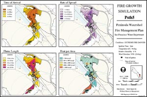GIS ImplementationSFPUC developed a GIS to help guide the resource planning phase and ultimately to manage all the watershed lands. Consequently, EDAW initiated a GIS Needs Evaluation to start the planning process. The evaluation strategy began with interviews of various personnel from all divisions within SFPUC's Water Department to assess existing software and potential future needs for data and management interactions. The next step was to develop a plan for both short- and long-term implementation of the GIS. A UNIX-based ArcInfo Workstation, including the ArcTIN and ArcGrid extensions, digitizing table, and color plotter, was selected for the initial hardware and software configuration. Using the goals as directives, EDAW's consultant team began developing a basic GIS database and designing a process for evaluating the watershed. The United States Geological Survey (USGS) 7.5-minute quad digital data was established as the basemap, and thematic layers were assembled and registered to the base from various primary and secondary sources. The basic data types included geology and soils, elevation, hydrology, vegetation, rare or endangered plants and animals, habitats (field recorded and potential), fisheries, archaeological and historic features, land status (ownership, leases, and overlay districts), roads, trails, utilities, and recreation facilities. Digitizing and data management were accomplished with ArcInfo software's digitizing and editing capability. Some of the basic data types were subsequently manipulated by various ArcInfo operations (such as overlay, reselect, recoding, dissolves, buffering, and latticepoly) to derive new layers. Examples of derived maps are slope (derived from elevation), vegetation fuel loads (derived from vegetation communities), and drainage protection zones from buffered hydrologic features. Along with the basic data, the derived maps formed the building blocks of models to create vulnerability maps. A model is the set of step-by-step instructions given to the computer to combine data in mathematical manipulations or graphic overlays. EDAW developed models in a vector-based data format using ARC Macro Language (AML) routines that incorporated various ArcInfo overlay processes and manipulations of attribute data in tables. Final analyses were generally ranged into high/medium/low categories for more simplified interpretation. The modeling process ultimately resulted in the generation of five vulnerability maps for ecological resources, fire hazard, slope instability, cultural resources, and water quality. "The real power of GIS is its analytical capabilities and its data integration," says Naras. "Our management project was quite ambitious, because it would guide policy for many, many years. Once we learned what we could do with GIS, it was obvious we needed the technology." Ecology Model Tells Tale of SensitivityEnvironmental Science Associates (ESA) and its ecology specialist, Diane Renshaw, provided the data and classification systems for the vegetation and wildlife studies. ESA developed the model for the Composite Ecological Sensitivity Zones, which combined the findings of the sensitive vegetation and wildlife communities and maps of special-status species (rare or endangered plants and animals). Frightening Fire HazardFire hazard is revealed by combining data from the vegetation fuel loads, slope, and dwelling densities maps. The fire hazard data was compiled by ESA, while the fire hazard model was developed by Wildland Resource Management (WRM). WRM followed guidelines set by the California State Assembly's Bates Bill, which was passed in response to the disastrous 1991 fires in Oakland hills. A fire management plan was prepared after the watershed study based on fire simulation models shown on page 20. Slope InstabilityBy combining the raw data for soils with the slope maps, then selecting from those resultant soil/slope categories the ones that are rated for severe and very severe erosion potential, the analysts were able to determine slope instability. Maps showing historic landslide sites were then added for predicted landslide potential. The Natural Resources Conservation Service (formerly the Soil Conservation Service) is converting most of its soils maps and ratings into GIS format, which will be available for many counties over the Internet. Cultural Sensitivity Survey Reveals HistoryDavid Chavez and Associates provided the base data for historic structures and prehistoric archaeological sites. Historic features included early water conveyances and an old stage road. The map of cultural sensitivity zones resulted from a comparative ranking of the historical resources. The archaeological basemaps were not released to the public. Water Quality ModelThe ratio of imported water to local runoff dictates the water quality as much as surface conditions in the immediate watershed. The model for water quality, developed by the Montgomery Watson engineering team, was based on a combination of approaches from similar studies throughout the United States. Factors included the size of the contributing watershed and its rainfall intensity, drainage buffer zones, slopes, various soil characteristics, vegetative cover, and wildlife concentrations. Soil attributes particularly were analyzed in great detail for determining water quality vulnerability to potential contaminations from microorganisms, nutrient, turbidity, and various volatile organic compounds. A Visual FrameworkThe high-sensitivity areas of four out of the five vulnerability maps were extracted and superimposed on a single map to form the Composite High Sensitivity Zones map within ArcInfo. The cultural sensitivity map was not included because policies were already in place to protect cultural resources. The comprehensive data map shows that about 10 percent of the watershed have no conditions that receive a high sensitivity rating, and about 35 percent have two or more conditions with hi
