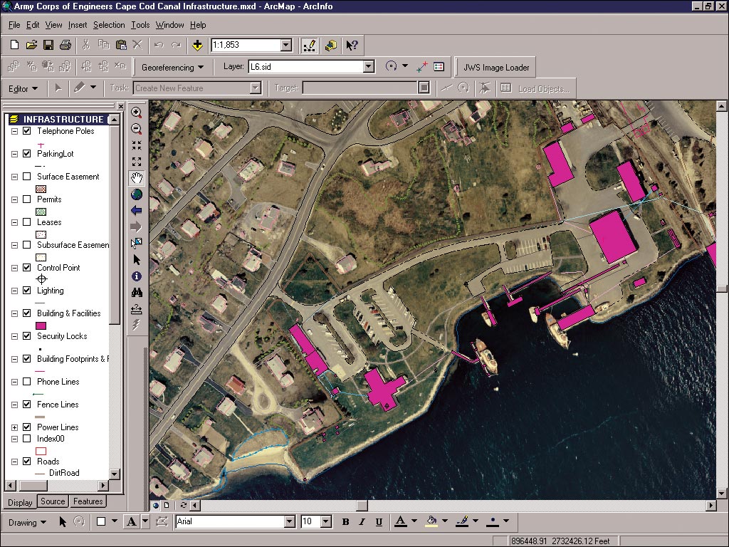 The U.S. Army Corps of Engineers is a worldwide organization that provides engineering services and construction support for a wide variety of military and civil projects. Since 1928, the New England District of the Corps has been responsible for the operation and maintenance of the Cape Cod Canal in Massachusetts. The canal, 17.4 miles long, is designed primarily to provide safe waterway navigation between Cape Cod Bay and Buzzards Bay, saving an average of 135 miles of coastwise travel around the cape's tip and outer shore. The canal is also operated as a federal recreation area available to the visiting public. The Army Corps of Engineers-Cape Cod Canal (CCC), a field office of the New England District, has utilized Esri products for the last 10 years to assist with the maintenance and operation of the canal. The existing ArcView 3.x system, comprised of a land base, digital orthophotography, and infrastructure mapping, has provided CCC personnel with a visual tool to monitor their facilities and assets. For better system management and tighter security, the CCC recently began a migration project from the existing system to ArcGIS Desktop. Canal personnel sought to utilize the new functionality of ArcGIS--the geodatabase structure, advanced ArcGIS editing tools with multiuser capabilities, wizard-driven menus, and high-quality cartography. On the foundation of the geodatabase, they planned to create a GIS model of the waterway system, developing a process and designing specific tools that would assist them in the dredging of the canal. Based on hydrographic surveys of the canal bottom, dredging is periodically necessary to eliminate sand and other excess material deposited due to the canal's swift current. The CCC currently uses manual processes to determine the amount and location of material to dredge. To accomplish these tasks, the CCC contracted Esri Business Partner James W. Sewall Company of Old Town, Maine, to assist with the geodatabase design; interface ArcSDE and Oracle configuration; data migration; and development of custom dredging, volumetric analysis, and estimation tools. Sewall's shared history with the CCC and experience with Esri products as an authorized Esri software developer were essential criteria for selection as a vendor. On previous projects, Sewall has provided the canal with digital orthophotography, digitally compiled photogrammetric and facility data in Esri coverage format, and a customized system using ArcView and ArcInfo. To upgrade the CCC's GIS, the Sewall project team utilized Oracle8i Release 3, ArcSDE 8.1.2, and ArcGIS 8.1 on a Sun Solaris 8 machine. The canal's geodatabase was designed in Visio 2000 Enterprise Edition. Custom dredging tools for the canal were programmed with ArcObjects, utilizing the viewing capabilities of the Esri extensions ArcGIS Spatial Analyst, ArcGIS 3D Analyst, and ArcScene for ArcGIS. Project DevelopmentTo exploit the advantages of the geodatabase over the coverage model and yet effect a smooth migration of data from one system to another, Sewall designed a geodatabase that was structured similarly to the CCC's current coverage model. Features, objects, relationships, and attributes were constructed to reflect the CCC's current schema. After completion of the geodatabase design and testing, the project team migrated the CCC data from the legacy system to the geodatabase. Data Migration--The process of data migration and ArcGIS configuration involved six essential steps: