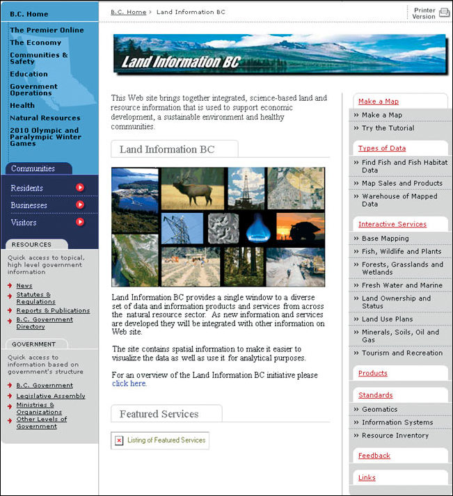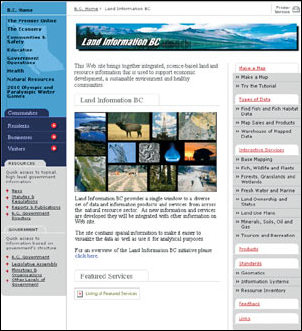 Land Information BC was designed to improve the management, access, and value of landownership as well as legal interest, geographic, and natural resource information for a range of clients. Guiding principles include connecting government, industry, business, academia, and citizens to meet their needs and preferences through easy and simple access (client focused); developing solutions collectively among public, private, nonprofit, and research partners on the basis of skills, experience, and expertise; and focusing on cost-effectiveness, innovation, value, and results. Land Information BC meets these designs and principles by providing integrated resource and land information, services, and value-added products to the resource sector businesses, industries, academia, governments, and the public in support of sustainable development and sound stewardship of our resources. Critical features are single window access to this information, interactive e-mapping services, and value-added science-based products. Changing the Delivery ModelNow in its third year, Land Information BC has changed the model for the delivery of land and natural resource information.