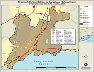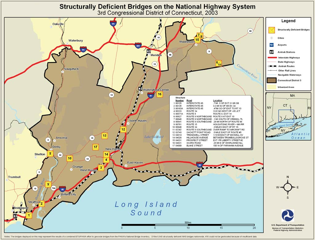 In April 1971, the first National Bridge Inspection Standards (NBIS) were issued to satisfy the mandate of Congress, and by the end of 1973, most federal-aid highway bridges had been inventoried. Today, the National Bridge Inventory (NBI) is substantially complete for all public road bridges and contains data collected and maintained in accordance with the FHWA "Recording and Coding Guide for the Structure Inventory and Appraisal of the Nation's Bridges." NBIS also establishes criteria for inspection procedures, frequency of inspections, and personnel qualifications. Approximately 590,000 bridges lay along the network of roads that crosses the United States. Bridges have a wide range of attributes and classifications such as cable style, suspension, arch, segmental concrete, and truss. Their constructions range from simple to complex. Other definitive characteristics include load and resistance factors, seismic design, and supporting elements such as ultra high strengths of concrete or steel. A bridge may contain intricate wall systems or feature hydraulic structures that involve complex stability countermeasures built into its design. Accounting for all U.S. bridges is complex because of the enormity of the count and the numerous variables included in bridge classification. Of particular interest to government agencies is bridge data about ownership, types, usage, levels of deterioration, and location. FHWA uses the NBI information to determine investment requirements; develop national data summaries for reports to Congress; respond to inquiries from Congress, the National Transportation Safety Board, and others; and provide support for formulating national policy. Bridge inventory maps were requested by Congressman James L. Oberstar, a senior member of the House Transportation and Infrastructure Committee. Oberstar, representing the Eighth Congressional District of Minnesota, is sometimes referred to as the nation's transportation guru. From USDOT's Bureau of Transportation Statistics (BTS), he requested maps of deficient bridges on the national highway system. To meet this request, bridge inventory data needed to be geocoded. Following a street data vendor evaluation process, BTS contracted Geographic Data Technology, Inc. (GDT), an Esri Business Partner, to perform the monumental geocoding task based on evaluation criteria that included coverage, geocoding ability, and willingness to work with the department. The mission was to precisely locate as many of these bridges as possible by matching NBI attributes to corresponding attributes within GDT's proprietary feature database. This was accomplished in two ways: through point conflation and manual intervention. In the point conflation process, attributes associated with a bridge, such as the route carried by the bridge and features passing beneath the bridge, were compared against feature names within the database. When a reliable match was obtained, the coordinates of the feature's intersection were assigned to the bridge. On the other hand, if a match was not obtained, or if a match was suspect, the bridge was queued up for manual review. In this review, editors used street, hydrology, rail data, and aerial imagery to aid in locating the bridge. Having adequate attribution on both the bridge and database features was key to achieving a match with a high level of confidence. A key challenge throughout this process was that the NBI file was an assemblage of multiple state databases containing a fixed set of bridge attributes. Unfortunately, some attributes were not always described consistently from state to state. Methods and procedures to consistently extract the value of these attributes were developed, maximizing the match rate achieved using GDT's existing conflation process. FHWA reports that approximately four million miles of roadway are within the country's transportation system. Working its way along this vast network, the coordinates of more than 460,000 of the nation's bridges (out of 590,000) within one year were captured. This significant sample provides the basis for some interesting geospatial analysis. Steve Lewis of BTS managed the project. Lewis explained that once GDT submitted the geocoded bridge data, it was loaded into a coverage. The coverage was converted to shapefiles. After performing quality controls to make sure the bridge data was showing that the bridges were indeed where they should be, a combination of templates and ArcInfo functionality was used to create the maps that Congressman Oberstar requested. Congressman Oberstar's initial request was for maps by congressional district for each member of the Transportation and Infrastructure Committee. After delivery of these maps, Oberstar requested additional maps for each member of the House, more than 430 maps. The complete set was delivered to Oberstar in February 2004. This was an impressive display of ArcGIS capabilities to an impressive body. But these maps are just the beginning of what GIS can do with the geocoded bridge data. Geocoded data in tables can be linked to other data tables to add more variables to a study. Using GIS for spatial analysis of the nation's bridges, a researcher could prioritize areas that should be targeted for immediate service. Another query could show the effects of weather conditions such as heat and wind or what consequences salt and chemical compounds have on the deterioration of bridges and how these trends in deterioration correlate with regions of the United States. For example, studies could be performed on correlations of bridge corrosion factors and the cold regions of Maine or the salty coastal regions of Florida. The researcher could validate a hypothesis about how certain bridge structures affect traffic congestion and how bridge structures and improvements are interrelated with urban development. From these types of spatial analyses, an engineer may be able to consider a design strategy in the context of a mor