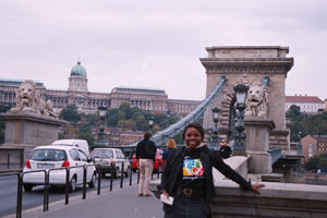 Lola Akinmade, GIS/Web application developer, Woolpert LLP (headquartered in Michigan), happened to find herself in Budapest, Hungary, recently in front of the Chain Bridge with the Buda Castle District in the background. Her Esri T-shirt is the icing on the cake. |