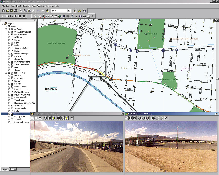 El Paso decided to meet these challenges by implementing a Traffic Management Information System (TMIS). The city began to search for a solution that would satisfy its requirements, which ranged from asset, service request, work order, and equipment management to pavement management. GIS functionality was seen as central to the system. Gerald Pucel, assistant street director, indicated that the key differentiator during the selection process was that the solution be GIS driven. The proposed enterprise solution placed the power of GIS at the system's core, giving the Street Department the ability to leverage the citywide GIS that was already in place while ensuring that any new GIS features developed by the Street Department would be accessible to all other city departments. The Esri team was selected by a citywide selection committee. The Esri Professional Services Division and Esri Business Partners Azteca Systems and TRANSMAP Corporation teamed up to develop and propose a comprehensive solution that would address the city's needs. System ImplementationTMIS was implemented in three phases. Phase I involved the deployment of an enterprise ArcSDE geodatabase, ArcEditor, and Azteca Cityworks asset and work order management software. Esri and El Paso configured the system and loaded the data necessary to provide Street Department personnel with the ability to create and manage service requests and work orders. The city was issuing service requests and work orders within three months. "The rapid deployment was well received by the user community during the first month," says Luis Vel�zquez, Street Department computer applications supervisor, "when more than 400 service requests and 1,500 work orders were created. Staff immediately realized the benefits of the GIS tools when locating service requests and work orders and planning daily maintenance activities." Phase II of the project involved collecting pavement and asset inventory information along 588 miles of existing roadway and 60 miles of new roadway. TRANSMAP Corporation, whose ON-SIGHT imaging technology was employed, led this phase of the project. Asset information was captured by a mapping van equipped with an inertial GPS and four positionally mounted digital cameras. The end product of Phase II was a highly accurate linear referencing system, a collection of road right-of-way assets, and pavement condition index ratings, all of which were stored in the ArcSDE geodatabase.