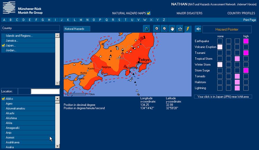 This is where a reinsurer, or an insurer of insurers, comes in. Munich Reinsurance Company, also known as Munich Re, operates from its headquarters in Munich, Germany, serving more than 60 reinsurance subsidiaries, branches, service companies, and liaison offices worldwide. Its business partners are insurers in more than 160 countries. These insurers transfer to Munich Re parts of the risks they assume. Whenever someone is faced with the task of assessing a risk or locationno matter where in the world and including natural hazard factorsthat person should know the risk potential from natural catastrophes. The result of this risk assessment may have an impact on the design and position of buildings, industrial plants, and infrastructure or influence the design of the insurance product and premium required. Munich Re's Geo Risks Research Department has been systematically gathering information on natural hazards and catastrophes throughout the world for more than 30 years. This information includes event location, date, and duration along with short descriptions of the events. Relevant information giving a quick overview of the magnitude of the events has also been compiled. Sometimes damage to or destruction of buildings, the effects on infrastructure, damage to utilities and agriculture, and other information are noted. The effect on the population, including fatalities, injuries, and homeless and missing persons, is also listed. Finally, the economic and insured losses are recorded. This data is crucial for analyzing and determining trends in the insurance industry. Now, Munich Re's partners can query these extensive databases of natural events and catastrophes using an intuitive mapping application called the NATural Hazards Assessment Network (NATHAN). NATHAN is the next evolution of Munich Re's well-known World Map of Natural Hazards and published World of Natural Hazards CDROM, the most successful publication (more than 100,000 copies) in Munich Re's history. Based on ArcIMS software, NATHAN is designed to create an efficient and easy-to-use interactive online tool to mine this comprehensive global database of natural hazards and catastrophes. NATHAN offers users of the system many benefits. Risk managers find that NATHAN provides support for efficient decision making by allowing them to choose their inquiry criteria so they can view what interests them. Underwriters will find tailor-made information for every risk location. Since NATHAN resides on Munich Re's electronic platform for its customers, these insurance partners can find this information no matter where they are located and at any time of day. This gives them quick response times when it counts. The NATHAN application resides on two Oracle 9.2 servers with HP-UX as the operating system. One Oracle server houses the natural hazards data and the other one the spatial information. These servers are connected to a Windows 2003 server equipped with ArcIMS, which serves mapping data through an .ASP connection to Microsoft's Internet Explorer 6.0. NATHAN is divided into three subcomponents: a world map, country profiles, and a catastrophe catalog. Through these subcomponents, the exact spatial distribution of natural hazards and their intensities can be viewed, and specific cartographic features can be generated to fit whatever view the user needs. "At a time when natural catastrophe losses are increasing throughout the world," says Dr. Juergen Schimetschek, Munich Re, "this data represents an important resource for the insurance sector and international research institutions. Insurers around the world can access the details and trends concerning the various types of loss events." For example, an underwriter would like to investigate the natural hazards for a semiconductor factory in Japan, approximately 30 kilometers south of Tokyo. The user logs on to ArcIMS and the NATHAN application by visiting the Munich Re Web site and providing a user name and password to the secure system. The user first locates Japan as the target area using the navigating tool in the system and zooms in. Once zoomed in to the selected area, the user receives information contained in the Country Profile, which is a country-by-country database with national statistics and gives an overview of relevant natural hazards. It also gives a statistical overview of geography, population, and economic strength of the country and the natural hazards the country is exposed to as a whole. The exposed areas are expressed as a percentage of the country's surface area. An underwriter viewing Japan, for example, would find that the country is prone to the hazards of earthquakes and tropical storms. Data can also be identified from the catastrophe catalog layer of data (which is equivalent to Munich Re's NatCatSERVICE, the comprehensive database of natural catastrophes that have happened throughout the world over the last 25 years). The catastrophe catalog permits a rough regional estimate of the frequency and intensity of natural catastrophes on a country-by-country basis. The events can be listed by type, country, date, and extent of losses. In addition to standard inquiries, the user can also formulate interactive inquiries on events, durations, countries, and regions. If desired, the results can be printed in a report or map. The exact spatial distribution of natural hazards and their intensities is best viewed in the World Map module. If a user locates Japan as the largest area using the navigating tool and zooms in, the various hazard themes can be selected and displayed one by one. Cities, borders, rivers, and a latitude/longitude grid can also be activated for better orientation on the map. The risk location can be pinpointed exactly using a list of more than 500,000 populated places worldwide. The user can measure distance using NATHAN's interactive Distance function. Then, the Hazard Pointer can be applied to find all hazards within the measured distance. For e