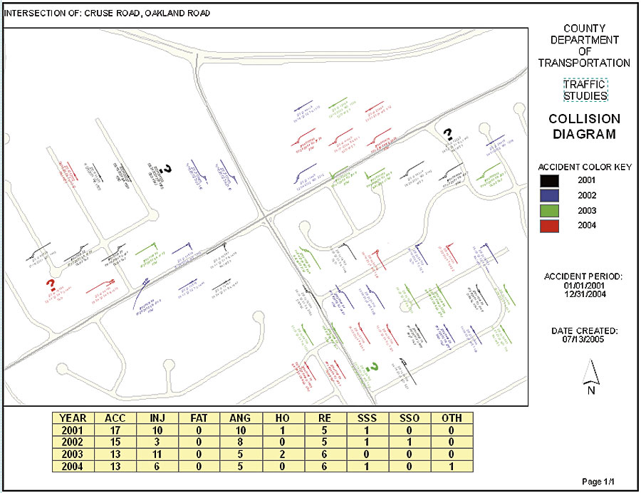 Until recently, Gwinnett County, Georgia, did not have the capability to truly analyze traffic accidents. It was using a traffic diagramming system that did not incorporate the spatial orientation of the roads where the accidents occurred. The problem with the old generic system is that not every intersection consists of two roads that come together at a 90-degree angle. If this were the case, any generic diagramming solution would work. But accidents occur in the real world where roads intersect at irregular angles and have curves. Gwinnett County is no exception. As part of the expanding Atlanta metropolitan area, the county has a complicated transportation infrastructure. When analyzing traffic accidents, transportation engineers must have a clear understanding of the contributing factors. How would analysts know if a road angle contributed to the accident if every intersection is plotted as a generic four-lane, 90-degree intersection? How would analysts know if the sun could have been in the driver's eyes or if a tree was blocking a driver's view? They wouldn't. They would have to know the spatial orientation of the intersection or drive to the site. In addition, the county had no way to plot midblock accidents. Midblock accidents are classified as all accidents that occur between intersections. The most common midblock accidents occur when someone pulls from a parking lot onto a busy street. The old method of diagramming midblock accidents meant running database queries and drawing the diagrams by hand. This process could take hours, depending on how many accidents occurred at a specific location. Despite having an established GIS program, the managers at Gwinnett County understood that they needed some expert guidance in developing a GIS-based traffic-analysis program. Following extensive investigation, the county picked Esri Business Partner Burns & McDonnell Engineering of Kansas City, Missouri, to help develop a real-world solution for collision diagramming. The county's new consultant then applied its ArcGIS Desktop (ArcView) extension TrueTraffic, which produces spatially oriented diagrams of accidents where they happened, whether at intersections or midblock. The extension works by querying the county's Oracle database for all the accidents that have occurred at a selected intersection or midblock location. The data stored in Oracle contains all the characteristics of an accident, including accident type, vehicle direction of travel, street names, vehicle maneuvers, and more. The application then analyzes each accident and places it in the appropriate location on the map. The map layout view in ArcView can include any additional features that the analysts want to evaluate. These features might include edge of pavement, road centerlines, signs, or aerial photos.