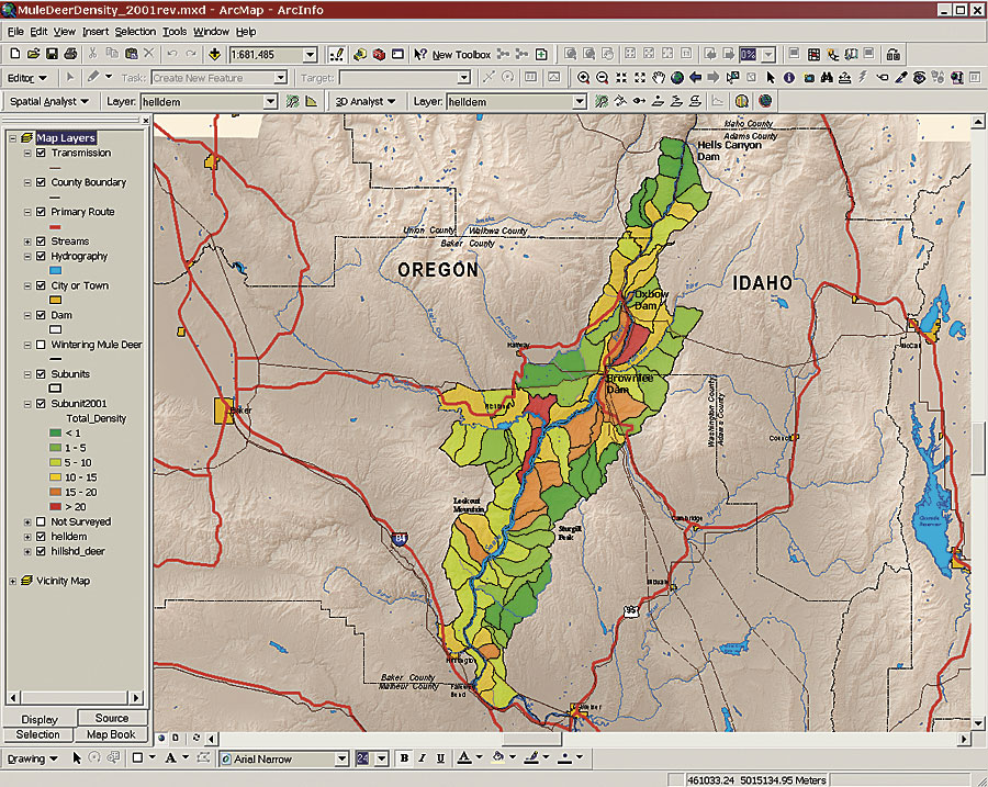 Idaho Power has been performing environmental analysis studies as part of its process to relicense the Hell's Canyon Complex with the Federal Energy Regulatory Commission. Included in the relicensing is a study of the area's mule deer population. Oregon and Idaho each has a large mule deer population. During winter, herds spend several months along the three-reservoir complex. Population estimates for the study area are between 10,000 and 15,000 deer. The study includes an assessment of how the deer interact with the reservoirs and how the reservoirs impact deer populations. ArcGIS Desktop software (ArcInfo and ArcView) was used extensively in this analysis. Trimble GPS units and Pathfinder Office software were used for data capture and postprocessing.