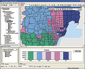 ArcGIS Business Analyst desktop software combines Esri's leading GIS technology with extensive business, demographic, and consumer household data to assist users with critical decisions, such as analyzing the market and competition, finding the ideal site for a new business location, or targeting direct mail. ArcGIS Business Analyst allows users to perform sophisticated business analyses in one easy-to-use application. By combining information such as sales data, demographics, and competitor locations with geographic data such as census boundaries, territories, and store locations, ArcGIS Business Analyst helps users better understand their market, their customers, and their competition. For the past three years, sales and usage of ArcGIS Business Analyst desktop analytic software have grown significantly in industries that perform marketing analytic applications. This pattern of growth is expected to continue as more organizations discover the unique capabilities of ArcGIS Business Analyst. Building on this success, the release of ArcGIS Business Analyst 9.2 includes more performance improvements and additional functionality. Based on client feedback, performance has been improved for report generation, data aggregation, drive times, and geocoding. Noteworthy new features include a unique territory design toolbar with automatic balancing, a capability normally developed as a stand-alone application; a new custom report wizard that makes it easier to use the Crystal Reports interface; a new geocoder using the Tele Atlas/TomTom address point database; and ImageConnect premium imagery from GlobeXplorer, an Esri Business Partner. Territory Design ToolbarArcGIS Business Analyst clients have requested a tool to help them define sales territories and analyze territory performance. Many organizations define and assign areas solely by size. An area's sales potential may be related less to the geographic size than to the underlying demographics or potential consumer expenditure characteristics of the customers who live there. Performance goals assigned for potential territories mean much more when they are based on quantifiable reasoning instead of an adjustment from last year's numbers. ArcGIS Business Analyst 9.2 demographic and consumer expenditure data can be used with location information for current customers and sales territories to set more justifiable and achievable performance goals.