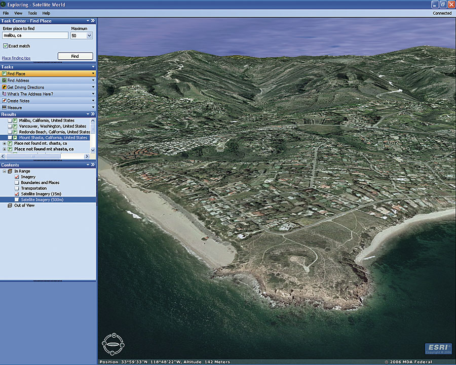 ArcGIS Online provides a series of worldwide 2D map services and 3D globe services that ArcGIS users can combine with their local data to support their GIS work. These ready-to-use services can be accessed with any ArcGIS application, including ArcGIS Explorer, ArcGIS Desktop, and ArcGIS Server. ArcGIS Online basemaps and reference layers are cartographically authored and support multiple-scale display. ArcGIS Online basemaps are perfect for use as background or overlay layers for locally created and maintained datasets. ArcGIS Online currently includes a collection of 2D basemaps and 3D globes, such as satellite imagery for the world; a natural Earth physical map; a digital version of the Political World map from National Geographic's Atlas of the World; a seamless, multiscale street map; and a historical world map from the David Rumsey collection. Under the current beta program, users can connect to and use all content free of charge. Later, there will be additional premium content available for a fee.