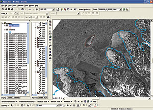Though not enough evidence exists to blame global warming for the collapse of the Ayles Ice Shelf, Mueller says that what occurred is consistent with other signs of climate change in the Arctic. "Taken together, all of these signs are worrisome," he says. Sizing Up the Ayles Ice ShelfHaving studied the ecosystems on the Ellesmere Island ice shelves as part of his Ph.D. research in biology, Mueller was invited to help investigate the Ayles Ice Shelf breakup and contribute to a paper the researchers were writing about the calving. In his work, through the university's Esri campuswide site license, Mueller used ArcInfo software to create a map that helped researchers visualize the chain of events and learn how much ice was lost from the fjord on the north end of Ellesmere Island. "The break was visible, but what we wanted to know was, What was the size of the ice island when it broke away?" Mueller says, adding that mapping and analysis showed it shrank from about 41 square miles to 33 square miles. "Aside from the loss of the Ayles Ice Shelf, 20 percent of the nearby Petersen ice shelf was also lost just after August 13, 2005. And some multiyear landfast sea ice (MLSI) that had been there since the 1940s was lost from Yelverton Bay to the west of Ayles Fjord." After georeferencing and projecting RADARSAT images (provided to the Alaska Satellite Facility by the Canadian Space Agency and its private partners) before and after the ice shelf breakup, Mueller imported the geographic TIFF (GeoTIFF) format into ArcInfo. With vector layers, such as coastline contour lines, from the Canadian government laid down, he traced polygons over the top of the RADARSAT images of the ice shelf taken at different times. "Using GIS, I put down several images that I could flick back and forth showing where the ice was before any of the activity, calculated the square kilometersthe area of that polygonthen looked again and saw where ice wasn't located," he says. "Then we could essentially calculate the ice loss," which was about 54 square miles, according to Mueller. "GIS also helps interpret satellite images," Mueller states. "What is good about that method is you can keep those polygons and flick the image to another time. Sort of like a time machine, you can flick backward in time and forward in time and watch for changes. And if you have a polygon or a vector overlay in ArcInfo, then you can look for your border underneath and, if it alters over time, you know you've got a change." In studying the Ayles Ice Shelf breakup, the researchers found that factors in addition to possible long-term climate changes likely contributed to the calving. In addition to higher-than-usual temperatures that summer, Ellesmere Island was struck by strong winds, according to Mueller. "A lot of the multiyear landfast sea ice broke away from the shorefrom the front of the Ayles Ice Shelfand a lot of the sea ice was pushed away as well," he says. "That was caused by very strong winds pushing offshore and alongshore. Those winds pushed away the sea ice, and that allowed the ice shelf itself the freedom to move away." Though the new ice island stayed put in the summer of 2006, Mueller says it's not stuck permanently. "It may last another year. It may last another few months. It's not necessarily stable ice." Even in winter, the humongous chunk of ice could begin moving again. "It's fairly exposed to all the currents that are churning around in that area," Mueller says. Mapping Ice TypesMueller also used ArcInfo several years ago when he mapped ice types while studying microbial mats on the ice shelves. Microbial mats, often present in extreme environments, are this planet's oldest known ecosystems. "I was interested in looking at cold-tolerant organisms in ecosystems that are ice dependent, he says, adding that "microbial mats composed of algae, microinvertebrates, and bacteria are commonly found on the surface of Arctic ice shelves. The ice shelves are a unique habitat for microbial mats, which can perhaps provide some clues as to what types of life existed when the planet was younger and how that life evolved." In ArcInfo, he mapped the ice types, such as the marine "basement" ice and the meteoric or atmospheric iced firn, and also noted the sites where he took samples of microbial mats. Mueller will use that map to refer to as he continues studying the changes in the Arctic ice shelves in the years ahead. "I'm looking for baseline information on the cryospherethe cold parts of the earthto look for changes due to climate warming." He adds. "Ice shelves may be a valuable indicator of climate change. When the ice shelves disintegrate, it represents a loss of habitat." He is concerned that the ice shelves may completely break up within his lifetime based on predicted warming of the Arctic. "Working to preserve habitats and biodiversity is important," Mueller concludes. "These ice shelves may harbor some cold-adapted organisms that could be interesting for biotechnology. Or you might simply value the habitats that we are losing from our landscape." More InformationFor more information, contact Derek Mueller, Geophysical Institute University of Alaska Fairbanks (tel.: 907-474-5382, e-mail: dmueller@gi.alaska.edu). |