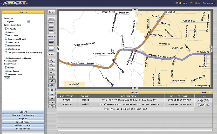 As the amount of GIS data grew, the agency faced the challenge of how to update and maintain the data, as well as leverage it as an asset throughout the agency. With a diverse workforce of 4,000, it could neither train everyone on desktop GIS nor require GIS experience as a hiring prerequisite. GDOT instead set its sights on creating highly visible and easy-to-use applications that made using GIS as easy as using the Internet. To build support for such an undertaking, GDOT implemented a pilot project called Transportation Explorer (TREX). Based on ArcIMS, TREX was designed as a Web application that served as an internal information clearinghouse and allowed the public to search GDOT maps, reports, and plans for all transportation projects in Georgia.