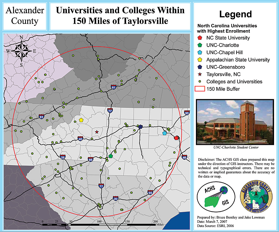 By George D. Brown, GIS/Addressing Coordinator, Alexander County GIS During the 20062007 school year in Taylorsville, North Carolina, the Alexander County GIS and Alexander Central High School GIS class embarked on a joint project to create and publish an informative, full-color map atlas of Alexander County. The GIS instructor, Eric Walker, initiated the idea of helping the county do some projects. From there, things moved pretty quickly. Alexander County donated six computers to the class, and Esri provided 12 one-year evaluation copies of ArcView with three extensions for each. Adding this to their existing computer base gave the students enough to get started. The county covered the cost of publishing the 160-page mapbook using ArcView and Microsoft Publisher and fees for Library of Congress, ISBN, and UPC codes. The students did the research and data collection and generated all the maps. In 12 weeks, they collected, designed, formatted, and assembled the publication on their own and later appeared before the county commissioners and county manager with a progress report on the book. Walker trained the students in the use of the software and served in an advisory position. George D. Brown acted as an advisor and the editor. The book contains information on all aspects of Alexander County life and is divided into sections, such as economic development, arts and recreation, retail, history, emergency services, and demographics. The book will be placed in the county as well as the school libraries and will be available for purchase from several county locations as well. The County Economic Development department now uses the book as a tool for prospective business relocations. "This is an amazing feat considering there were only 15 students in the class and half of them were using ArcView for the first time," says Walker. "This book is proof that with the proper technology and motivated students, even a small rural county like Alexander can achieve amazing results. We hope this encourages other counties to undertake projects with their schools to bring GIS into more high schools across the country. Almost every aspect of daily life uses some form of GIS, and getting students interested can only result in more creative uses and applications of GIS in daily life." The North Carolina Association of commissioners awarded the project with its Outstanding County Program Award. More InformationFor more information, contact George D. Brown, GIS/addressing coordinator, Alexander County GIS (e-mail: gbrown@alexandercountync.gov, tel.: 828-635-3024). |