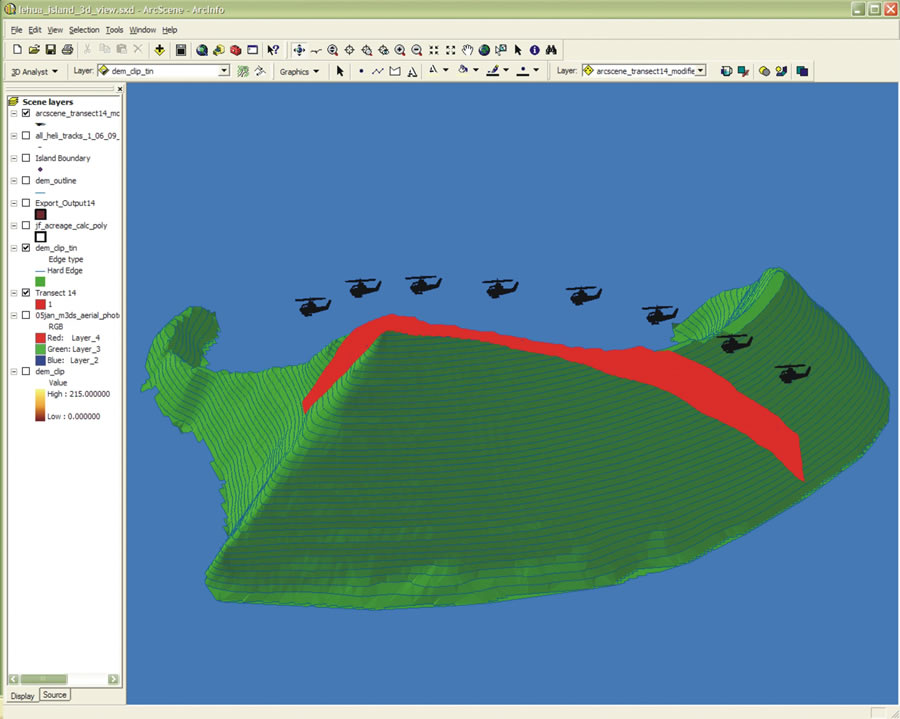 All data was stored in Esri shapefile format on a removable compact flash (CF) card. The AgGPS Trimflight 3 System in-cockpit display and lightbar provided the pilot with instantaneous guidance along flight lines. The team downloaded GPS data from the CF card during bait reloading and helicopter refueling. Once downloaded, GIS and GPS data was imported into ArcGIS to track and document bait distribution. The team used ArcGIS ArcInfo ModelBuilder and scripting to quickly and efficiently transform downloaded AgGPS Trimflight 3 System data to highlight areas on the island where the helicopter may have failed to broadcast bait and where swaths had overlapped. In a nutshell, this entailed splitting the multipolygon transect layer into individual polygons, converting all polygons to raster files, then overlaying the raster files to create a bait distribution density map. The goal of the bait drop was to broadcast bait uniformly over the entire island. ArcInfo was also used to calculate the three-dimensional surface area of the island. The topography of Lehua is very steep, so the 3D surface area is much more than the 2D planimetric area of the island. Determining correct surface area of the island was very important, because all rats must be exposed to lethal dosages of bait to achieve eradication, and the Environmental Protection Agency label determines the maximum amount (kg) of bait that can be broadcast per unit area (ha). A second bait broadcast occurred on January 13, 2009, to ensure an adequate exposure period. Anticoagulants are far more effective when ingested in small doses over multiple days. This also circumvents the rodents' ability to detect toxins in their food because symptoms are delayed for days after a lethal dose is consumed. Environmental monitoring of the fate of bait pellets occurred after each bait drop. The team mapped terrestrial and marine plots with a Trimble GPS unit prior to the first bait broadcast. Bait pellets were counted within plots to confirm spread rates on the ground and measure bait disappearance by rats after each drop. Intertidal invertebrate, fish, soil, and seawater samples were also collected 24 hours later and again seven days after each bait broadcast to determine if diphacinone residue was present in any nontarget organisms or the environment.