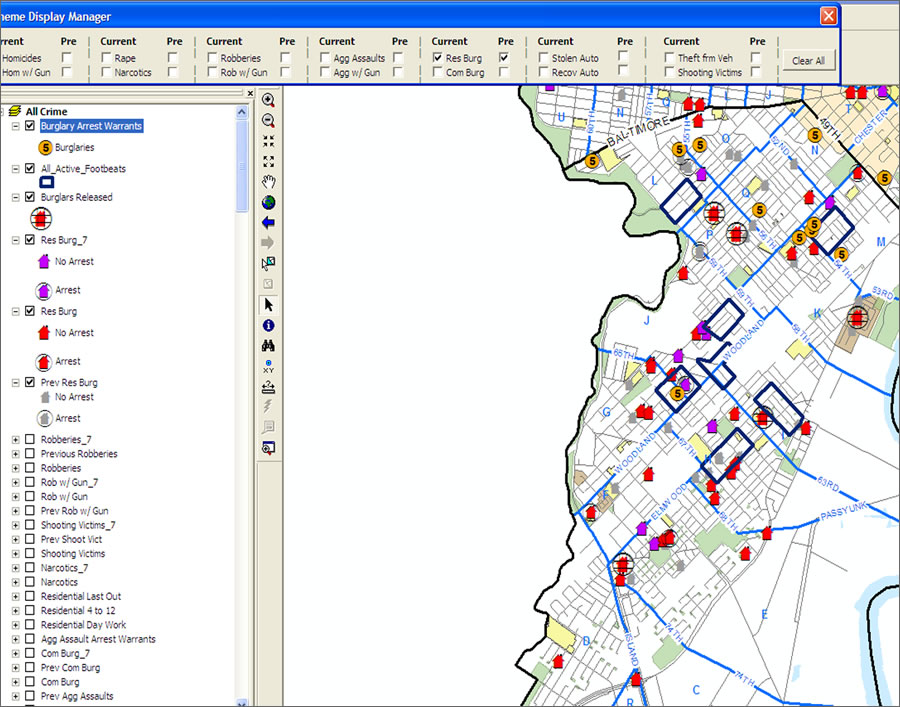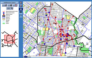 GIS gives PPD an information-based resource for strategically placing field personnel and executing policing programs that help it deter crime, apprehend suspects, and quickly respond to emergencies. Information flows throughout the organization. The agency proactively stays ahead of the crime-fighting curve. Today, PPD uses ArcGIS 9.3 software, Microsoft Visual Studio, Microsoft Access 2002, and Microsoft SQL Server 8.0. The GIS can access more than 150 geographic data layers, with more than 50 of these maintained by the unit. The unit geocodes more than 5,000 incidents each day and nearly 2.5 million incidents annually. The geocoded incidents have specific symbols based on crime type. The types of services include printed maps, database reports, statistical graphs and charts, and intranet mapping services. Ad hoc requests are also done. The unit produces as many as 50 maps a week. This can include regularly updated incident maps, such as weekly or monthly maps showing crime density, locations, police beats, arrests, calls for service, citations issued, and car accidents. Points of interest are also mapped, such as liquor-licensed establishments, surveillance camera locations, hospitals, nightclubs, shelters, and halfway houses. In addition, data on buildings, railways, sidewalks, alleys, and open areas is integrated into the GIS. Special units served by the Crime Analysis and Mapping Unit include homicide, narcotics, major crimes, highway patrol, and crime scene. The Mapping Unit also serves the district attorney's office for court preparation by frequently providing court maps. Staff can fill out an online request, phone in a request, or go to the unit in person to ask for a map product. Senior ranking officials attend weekly computer statistics (COMPSTAT) meetings held at agency headquarters to review recent events, share work activities for each police district, and jointly plan future policing programs. Crime in each police district is broken down by type and further analyzed to identify the place of occurrence as well as the time of day, day of the week, and week and month of the year. Homicides, rapes, robberies, and aggravated assaults are divided into incidents committed with and without guns. Aggravated assaults are further classified as domestic or nondomestic. Burglaries are listed as residential or commercial. Thefts are classified as retail theft, theft from a person, theft from an auto, and auto theft. Data is also captured for incidents involving shootings and gun arrests and seizures. The unit currently has several GIS applications available to police personnel from any desktop or laptop computer via the department's intranet Web site. They consist of three major components: