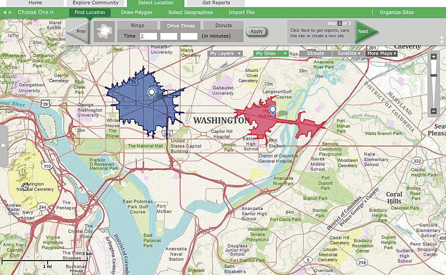 Users can also visualize the data on a thematic map or aerial imagery and view changes immediately on an interactive map as parameters are adjusted. Customized drive times or rings can be selected to allow users to learn more about the types of people who live in a particular location. For example, the Tapestry Segmentation Profile report reveals the neighborhood types that live in each area, including demographic and socioeconomic characteristics and preferences, such as Internet usage, types of radio programs listened to, and hours of daytime TV viewed. This type of detailed information can be helpful in determining how to best reach individuals living in these areas. For easy collaboration and information sharing, users can also generate and e-mail print-ready reports and maps in PDF or Excel format to other stakeholders.