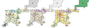 After preparation was complete, the actual mapping of the new zoning code occurred in waves based on varying levels of complexity, from areas where existing conditions aligned in concept, use, and regulation to areas with conflicting conditions that required additional analysis. For example, a close look had to be taken at sites zoned for multifamily or high density but identified as primarily single-family neighborhoods or where regulated industrial areas were transitioning to mixed-use residential developments. The CPD GIS team provided information and maps to the planners, who would then return them marked with proposed boundaries to be digitized in ArcGIS. Over time, these boundaries were pieced together to form one complete citywide new zoning layer.