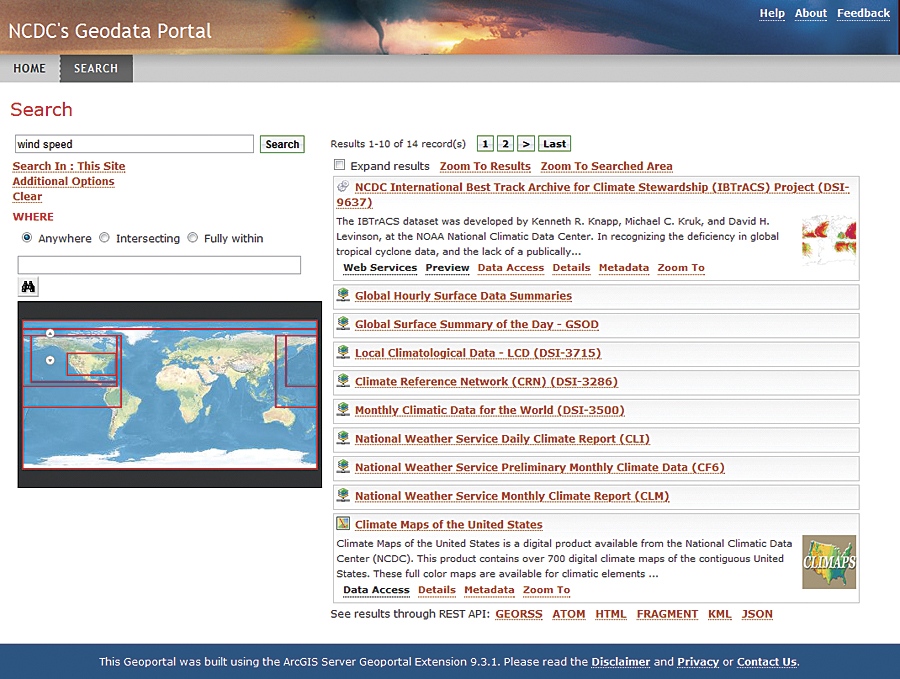 Esri's geoportal technology gives organizations the capability to aggregate geospatial resources for improved discovery, use, and collaboration. It does that by using standards such as OGC's Catalog Service for the Web (CSW), which simplifies the cataloging and inventorying of metadata. Before implementation of CSW, data producers submitted their metadata to data clearinghouses, such as Geospatial One-Stop. However, since clearinghouses couldn't update metadata records as frequently as the owners of that metadata, information quickly went stale. CSW changed that by allowing datasets and metadata to be virtually centralized in data portals maintained by users. Using geoportal technology implemented with CSW gives users the ability to search both other geoportals from within the NCDC Geodata Portal interface and the NCDC geoportal from ArcGIS Desktop, ArcGIS Explorer, and Flex-based mapping applications.