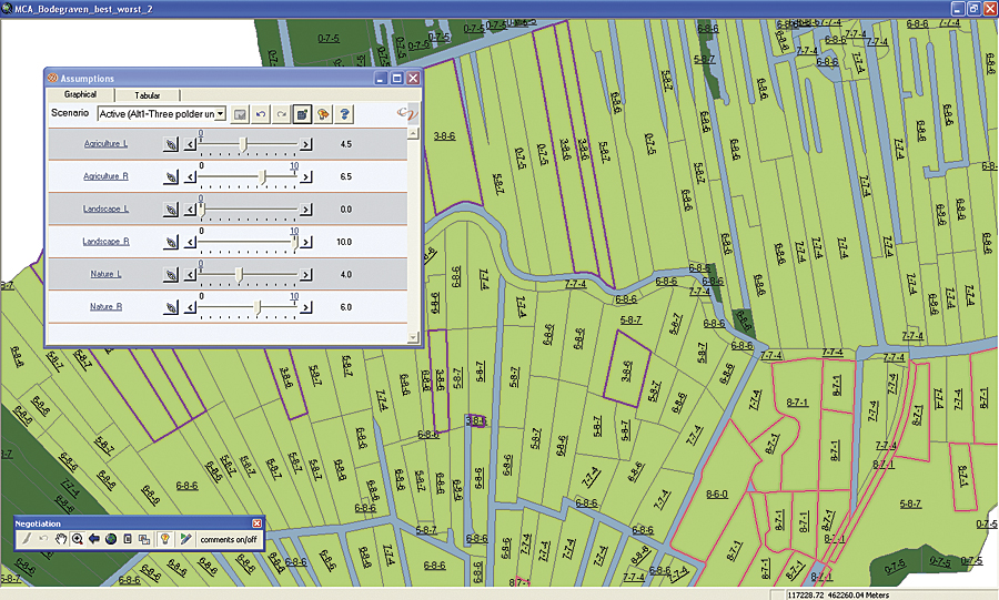 The negotiation workshop supported the process of collectively changing the current land-use pattern of the polder into a new, negotiated plan. Participants were the institutional stakeholders: the water board, the City of Bodegraven, the Province of South Holland, and nature conservation organizations. To support negotiation, the project team used multicriteria methods to show trade-offs among stakeholder objectives. Stakeholders used Scenario 360 to adjust two kinds of trade-offs: qualitative and quantitative. Qualitative trade-offs were identified by selecting polygons that were "very suitable" or "very unsuitable" for each potential land-use type based on their summed area and ranked multicriteria analysis (MCA) value.