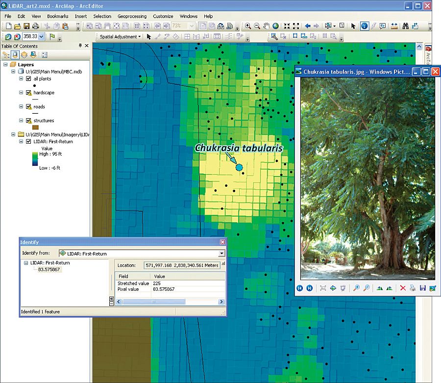 For another project, staff adapted a conventional forestry analysis using first-return lidar images to appraise height and breadth information to establish potential candidates for national or state champion tree status. This was done by simply overlaying the plant point feature class over the first-return image and visually identifying the highest canopies. The plant curators also applied their in-field knowledge of the various species' usual growth habits to propose more individuals for assessment, the height and spread of which were also checked in the lidar map. As of this writing, 27 trees had been awarded state champion status by the Florida Division of Forestry, and 2 trees received national champion status from American Forests.