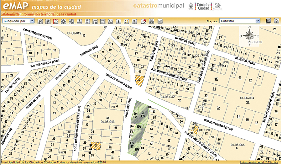 The eMAP system has a wide range of functions, such as getting cadastral information through multiple searches; cadastral management tools, including reservation of the nomenclature; different map services (public lighting, private works, official plan of Córdoba, values map); the ability to report incidents and choose the quality of output maps; and links that associate the map with the bank of scanned maps.