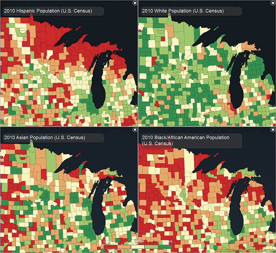 In this example, dynamic layers (new at 10.1) provide web application developers with complete freedom to define how multiple layers within a service are displayed. Here, four synchronized map layers from the same service are individually symbolized and arranged for visual analysis.