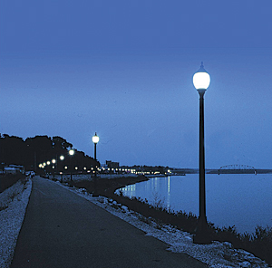 The City of Muscatine bike trail along the Mississippi River is lit with period lamps known as the "String of Pearls."