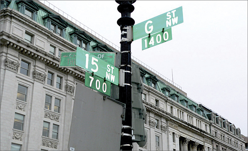 The Master Address Repository-Spatial Database consists of building addresses, city blocks, intersections (such as that shown above), and other location identifiers in Washington, DC. (Photos courtesy Darren Murphy.)