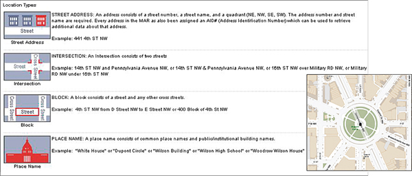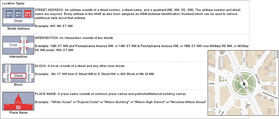 Visitors to the DC GIS/Master Address Repository public website portal view the various planimetric data that comprises the DC traffic grid system: blocks, intersections, addresses, and place-names (see inset above).