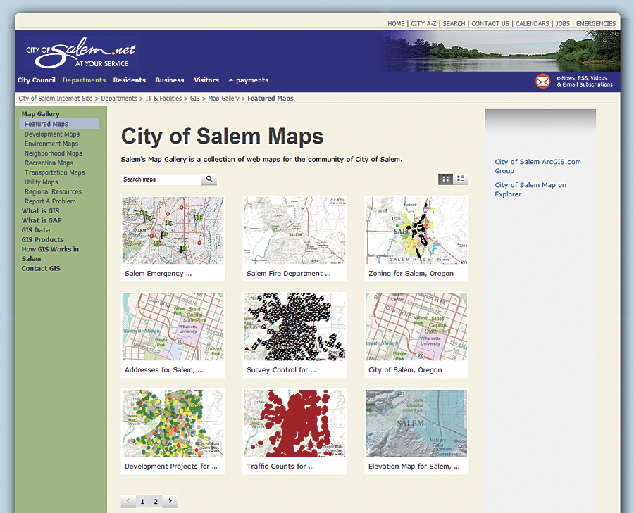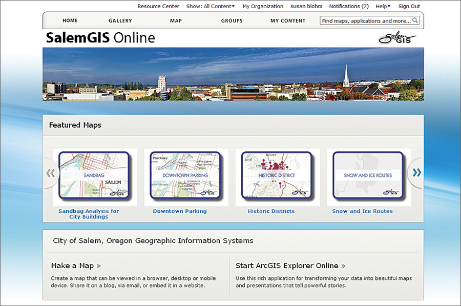 To get the most out of testing ArcGIS Online for organizations beta, the City of Salem has created a small, cross-departmental test group. This group collects and provides feedback by going through all the major processes in ArcGIS Online: publishing maps and hosted services; creating groups; and sharing maps through private, organizational, and public groups. To give more meaning to the ArcGIS Online beta project, each member of the beta testing group has committed to create some type of product that can be shared at the end. This includes employment and economic development maps, mobile code enforcement, mobile graffiti mapping, and mapping out public works projects, among others. The city has also taken advantage of being able to customize the ArcGIS Online for organizations home page. It added the Salem GIS logo and designed the look and feel of the map icons to reinforce the city's brand. The Map Gallery and Featured Maps sections display city maps, and users can choose from the city's own basemaps. "With ArcGIS Online, what we have now is a better catalog of our maps, data, and apps," says Brown. "It's a nice gateway that the city was missing and a destination for both our internal users and the public that will help us improve customer service."