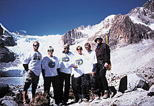Geography students and faculty from Appalachian State University used GPS and GIS to map the Laguna Glacier above Sorota, Bolivia. They mapped the glacier (16,500 feet elevation), moraines, and the glacier terminus. Pictured from left to right are Trey Schweitzer, Patrick Kennedy, Perry Baker, Jordan Hill, Mark Isley, and Dr. Andrew Klein (Texas A&M University). |