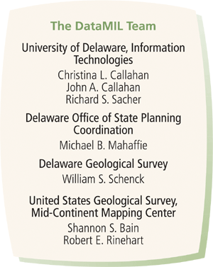 Several organizations played key roles in the initial planning and deployment of the DataMIL project. DataMIL is a partnership of the Delaware Geological Survey, the Delaware Office of State Planning Coordination, the University of Delaware, and the USGS. DataMIL is one of nine pilot projects of The National Map and is a primary project of the Delaware I-Team, the DGDC, and the State Mapping Advisory Committee. It is the only pilot of The National Map with statewide coverage and a complete, functioning Web-based implementation. At present, it is viewed within USGS as the potential prototype to achieve their vision of The National Map. "DataMIL constitutes the Delaware component of The National Map and serves as a model for federal-state-local partnerships across the nation," states Demulder. The Delaware DataMIL project provides a technological, organizational, and operational geospatial data infrastructure for Delaware and the nation. For academic users, DataMIL is a powerful resource for classes and research across a wide range of disciplines and at all levels of sophistication. For municipal, county, state, and federal agencies, DataMIL provides access to a common set of base geospatial data and reduces data duplication and inefficient data sharing. For data providers, DataMIL provides new ways to help keep their data current. For the general public, DataMIL provides easy access to the State's common base of official geospatial data. This improves community awareness and informed participation in Delaware's land use and natural resource planning and policy development. These benefits all support the current national efforts in mapping as well as the Livable Delaware Initiative of Delaware's Governor Ruth Ann Minner. Governor Minner says, "Dependable, accurate data and information are part of the shared knowledge infrastructure we need at all levels of government. Our Delaware GIS community has taken an important step forward, creating a new tool to ensure that Delawareans have access to the best possible data and information. Delaware was the first state at the start of the nation; now we're ready to be the first state in The National Map for the 21st century." For more information, contact John Callahan, GIS technical lead, Research & Data Management Services, Information Technologies, University of Delaware (e-mail: diodata@udel.edu, tel.: 302-831-1978) or visit the Delaware DataMIL Web site (datamil.udel.edu). Visit nationalmap.usgs.gov for more information regarding USGS's The National Map. |