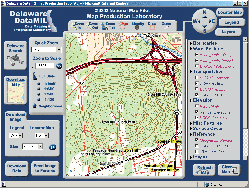 Within DataMIL's g.net architecture, three applications compose its core functionality: the Portal, the Map Production Laboratory, and the Discussion Forums. General users will spend most of their time in DataMIL with these three applications. For more advanced users, the Delaware Metadata Explorer and the Data Integration Laboratory complete the picture. The Portal is the entry to the Delaware DataMIL and provides project information and links to resources and describes the options available to the user. All DataMIL applications can be accessed from the Portal. The Map Production Laboratory is an ArcIMS application offering image, feature, and ArcMap image services. It provides capabilities to browse and select digital geographic data layers to create maps of any part of the State. Users can create and view maps on the Web; search for any Delaware name in the U.S. Geographic Names Information System (GNIS) or DelDOT Road Name database; or create high-quality, downloadable, printable maps with the familiar look and feel of USGS topographical maps. Users can even download shapefiles and georeferenced images for inclusion in desktop GIS packages. In addition, they can connect directly to the ArcIMS DataMIL map services for further analysis with ArcGIS, ArcIMS, ArcExplorer, or ArcReader software.