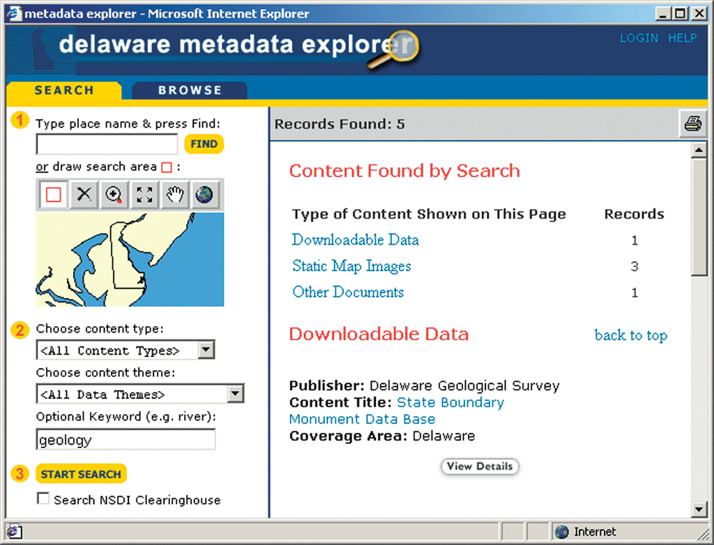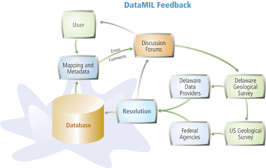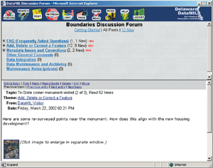 A major goal of DataMIL is to foster ongoing discussions about Delaware's spatial data framework. The Web-based DataMIL Discussion Forums facilitate dialog between the agencies responsible for updating geographic data sets and the public that use those data sets. If, for example, someone found an apparent error in a map produced by the Map Production Laboratory, that user could electronically post an annotated copy of that map directly to a Discussion Forum. Each posting is addressed by the forum gatekeeper and forwarded to the appropriate data steward. The underlying concept is that citizens, scientists, urban planners, etc., have a keen awareness of changes that happen in their local vicinity. The forums provide a convenient and efficient mechanism for getting that information to data providers. In addition, the forums provide a place for data stewards to work collaboratively within and among cooperating agencies and departments to improve the State and national geographic databases. The Delaware Metadata Explorer is a Web-based search engine connected to Delaware's National Spatial Data Infrastructure (NSDI) Metadata Clearinghouse node. This node is maintained by the University of Delaware on behalf of, and in cooperation with, the entire Delaware GIS community. This service is built around Esri's ArcIMS Metadata Services. Metadata is a standardized description of data--the who, what, when, where, why, and how information. It describes such things as data quality, resolution, intended purpose, update frequency, and many of the technical details needed by GIS professionals who use the data for analysis and planning.