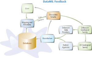 Another prominent issue facing the geographic data user is the enormous amount of information available today. For instance, a researcher at the University of Delaware is studying population movement within the State. A quick search on the Web for transportation data reveals numerous options. Digital data of the roads in Delaware can be obtained from the Delaware Department of Transportation, U.S. Census Bureau's TIGER/Line files, United States Geological Survey (USGS) digital line graphs (DLG), or a number of private companies that charge a fee for a more accurate and current data set. How does the researcher select a data source without spending countless hours reading through metadata? Furthermore, can the researcher be sure that the roads data set will align properly with other data sets needed for the study such as local boundaries, land use areas, or water features? g.netThe Delaware Data Mapping and Integration Laboratory (DataMIL) project attempts to solve these problems for users and maintainers of Delaware geographic data by deploying the basic Delaware Spatial Data Framework in one central--but distributed--application. More than just laying the foundation of the Delaware Geography Network, DataMIL acts as a true implementation of Esri's g.net principle. DataMIL is an interactive, online collaboratory to facilitate collection, integration, maintenance, distribution, and mapping of geographic framework data. DataMIL's primary objective is to provide an environment for local, state, and federal agencies and the general public to communicate and develop the most accurate, up-to-date geographic database possible for the State of Delaware. Simultaneously, DataMIL provides a central location where users can access all of Delaware's spatial data sets and be assured that these data sets work together and adhere to a high standard.