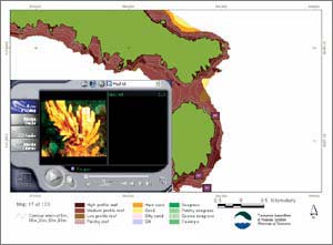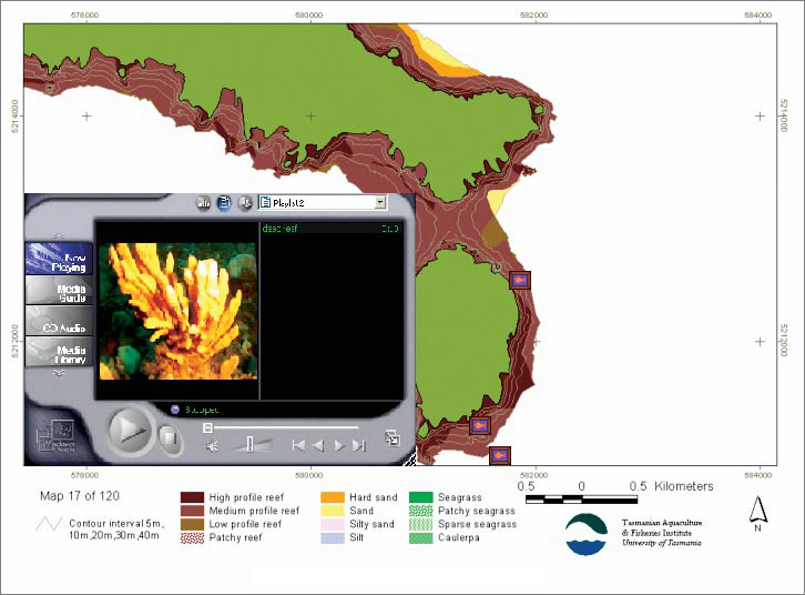 A submersible Benthos 4208 8x zoom color video camera was deployed at selected sites to verify echo-sounder classifications and obtain more detailed information on habitat attributes. In addition, video transects were conducted at regular intervals on rocky reef areas perpendicular to the shore along the depth gradient. Depth, substrate, position, and dominant macroalgal species were recorded at regular video drop depth intervals for each transect. The video footage was reviewed in the laboratory and, in conjunction with the field notes, used to estimate the percentage cover of the major dominant algal species. This information was correlated against depth and exposure to determine characteristic biotic community types for combinations of each of the physical variables or habitats. A representative image was taken from a range of depths at each video transect site and archived. Data files from the Seabed Mapper program were imported into ArcView 3.2, as well as habitat point data, which was used to generate shapefiles by on-screen digitizing of habitat boundaries. At 1:2,000 scale the points were carefully connected to form polygons of similar habitat type. The outer boundary of the polygon was generally identified in the field, and with these points overlaid on aerial photographs, a habitat boundary was identified and a polygon drafted. The rectified aerial photographs were primarily used to help determine the boundaries between shallow sand and reef. Shapefiles of the habitat types have been stored on the ArcView 3.2 GIS platform. Three hundred video stills and short videos have been hot linked to the polygons allowing the user to visualize the dominant species and understand what the habitat, which is represented as a colored polygon on the spatial map, actually looks like. One hundred and twenty 1:25,000 habitat maps of the region have been generated and are available through TAFI, coinciding with the release of the 2001 report Mapping of Inshore Marine Habitats in Southeastern Tasmania for Marine Protected Area Planning and Marine Management--Tasmanian Aquaculture and Fisheries Institute, University of Tasmania, Hobart Tasmania, Australia, by N. Barrett, J.C. Sanderson, M. Lawler, V. Halley, and A. Jordan. The work presented here will lead to a more detailed understanding of the resources of Tasmanian coastal waters and, from the strength of the GIS platform established, will allow more detailed community descriptions to be developed in the future as resources become available to conduct fine-scale biological inventories. For more information, contact Vanessa Halley or Miles Lawler, Marine Environment Section, Tasmanian Aquaculture and Fisheries Institute, Nubeena Crescent, Taroona, Tasmania, Australia (e-mail: vhalley@dpiwe.tas.gov.au, Web: www.utas.edu.au/docs/tafi/TAFI_Homepage.html). |