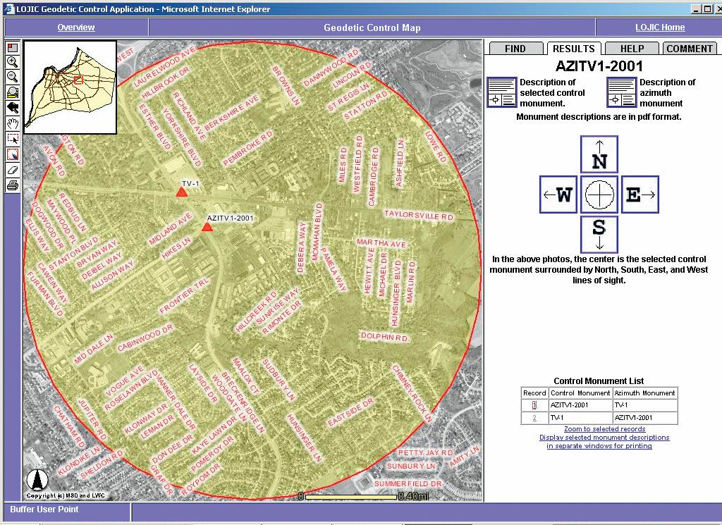 An approximate two-mile grid of geodetic control across Jefferson County (less in the urban core of Louisville) tied to the National Geodetic Survey (NGS) High Accuracy Reference Network (HARN) was sufficient to meet these needs. To minimize the installation of new monuments, existing control records were researched and field reconnaissance was performed to identify existing control monuments that were of suitable location, quality, and condition to be incorporated in the new geodetic network. In the summer of 2001, LOJIC contracted GRW Aerial Surveys, Inc. (Lexington, Kentucky) to recover existing survey control monuments, install numerous new monuments, and survey the existing and newly installed monuments using GPS survey techniques. LOJIC also contracted Fowler Surveys, Inc. (Elizabethtown, Kentucky), to monitor field activities and perform independent technical quality assurance throughout the project. New control monuments were installed in intervisible pairs consisting of a primary monument and an azimuth monument, each with an accurate coordinate position and elevation. LOJIC's Geodetic Control MapTo facilitate and enhance this effort, LOJIC developed an ArcIMS application to provide public access to the control data via the Web. This application, LOJIC's Geodetic Control Map, is the latest in a number of interactive maps that are accessible through the LOJIC GIS Web site. The Geodetic Control Map uses local digital orthophoto imagery in MrSID format as its basemap along with street names and control monuments, which are maintained in an Oracle/ArcSDE geodatabase.