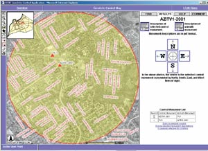 Users can navigate and zoom in to an area of interest by entering a property parcel number, site address, street intersection, or the name of a specific control monument. One or more monuments may be selected in the map view by dragging a box or specifying a selection radius and clicking a center point on the map. Individual monuments may then be selected from a pick list. Control description sheets and reference photos for the selected monument can be displayed and printed by clicking on the appropriate icon. A simple preformatted site map may be created from the map view and users can display or download a County-wide geodetic control index map, the project survey report, and related project documentation. The Geodetic Control Map includes a detailed user guide, online help, and several links to a comment form that allow users to communicate suggestions and report on the condition of the control monuments via e-mail. New project databases accessible through the Geodetic Control Map include a control point geodatabase, control descriptions, digital photos of each monument, and north, south, east, and west lines-of-sight. GIS ResourcesLOJIC is no stranger to publishing interactive maps on the Internet, having already used Esri's ArcView IMS software. The Geodetic Control Map is LOJIC's first application to utilize the more robust ArcIMS software and an Oracle/ArcSDE geodatabase. While the majority of the Geodetic Control Map was assembled using the out-of-the-box capabilities of ArcIMS, the look, feel, and functionality of the final application was customized using HTML, JavaScript, and XML. Esri's Geography Network was a source of many ideas on format, presentation, and functionality. For more information on LOJIC GIS and the interactive Geodetic Control Map, visit www.lojic.org or contact Alex Talbott, Jr., LOJIC (e-mail: talbott@lojic.org, tel.: 502-540-6324) or Curt Bynum, LOJIC (e-mail: bynum@lojic.org, tel.: 502-540-6121). |
